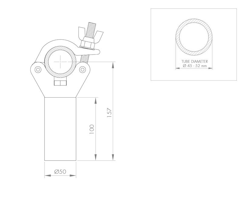 Half coupler with a Ø 50 mm adaptor. Fits Ø 45-52 mm tubes WLL: 500 kg