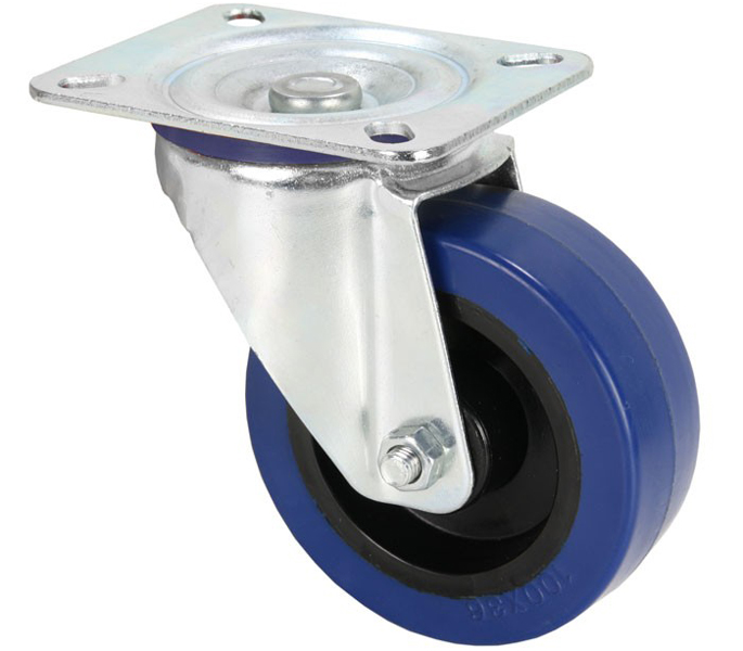 372151 – Swivel Castor 100 mm with blue Wheel: Swivel Castor double ball race swivel 2 mm steel frame distance of mounting holes: 60 x 80 mm