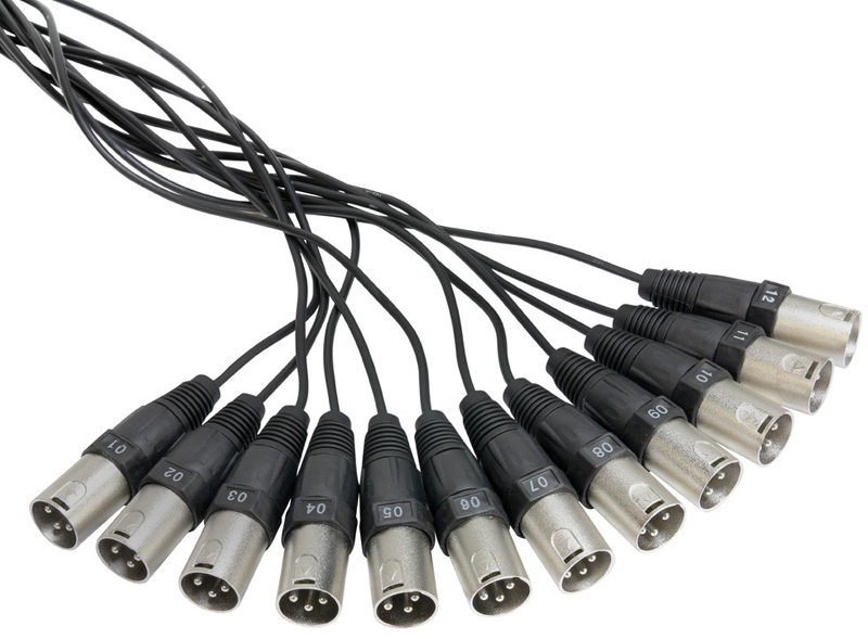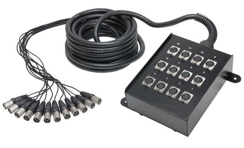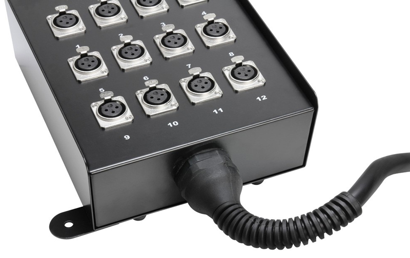 K12C10 – Multicore with Stage Box 12/0 10 m Twelve-channel subcore with permanently attached ten-metre cable terminating in twelve Adam Hall XLR plugs. The all-metal stage box has a solid strain relief in the transitional area between box and cable and an additional mounting lug for permanent installation. The additionally reinforced transition to the terminations prevents fatigue and cable breakage.