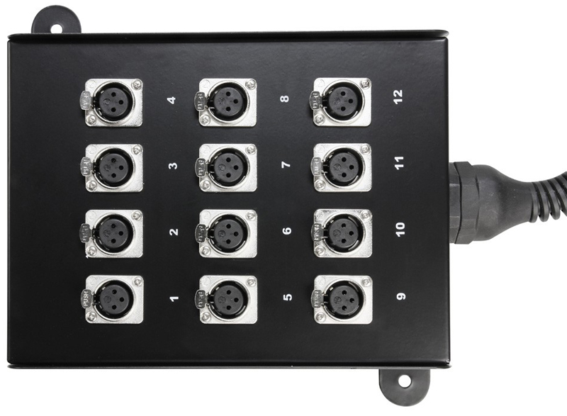 Twelve-channel subcore with permanently attached ten-metre cable terminating in twelve Adam Hall XLR plugs. The all-metal stage box has a solid strain relief in the transitional area between box and cable and an additional mounting lug for permanent installation. The additionally reinforced transition to the terminations prevents fatigue and cable breakage.