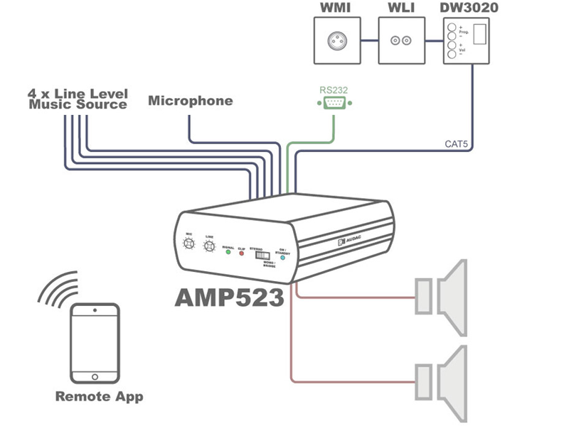 The AMP523 is a Mini Stereo Amplifier with an Integrated web based control unit, featuring four stereo line inputs and one balanced microphone input with phantom power. It has an output power rating of 2 x 15 Watt.