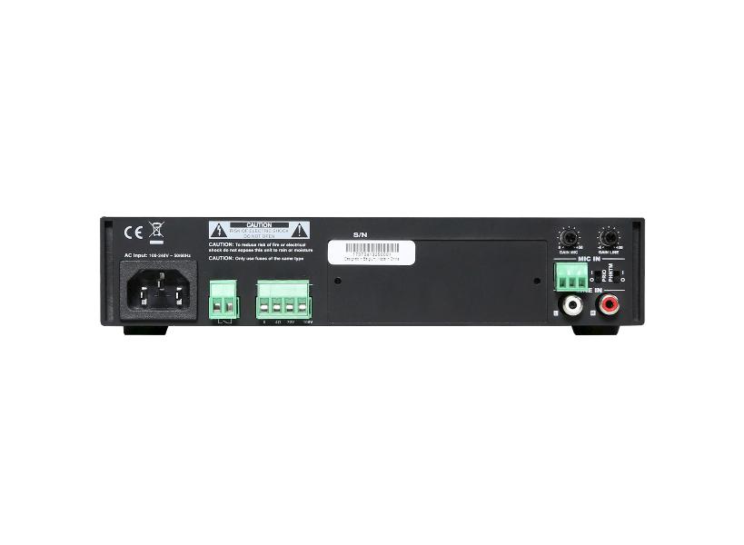 The amplifier is designed using Class-D amplifier technology and delivers an output power of 40 Watt to constant voltage (100V and 70V) or low impedance (4 Ohm) audio systems. A switch mode power supply allows compatibility with a wide variation of mains voltages for global compatibility.