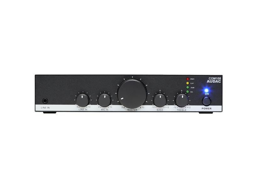 Public Address Amplifier 80W 100V The COM108 is a compact but versatile public address mixing amplifier which offers solutions for small to medium size audio systems in commercial installations. Typical application are background music systems in retail stores, bars, restaurants and office buildings. The compact and simple design allows installation in any location and operation through any possible user.