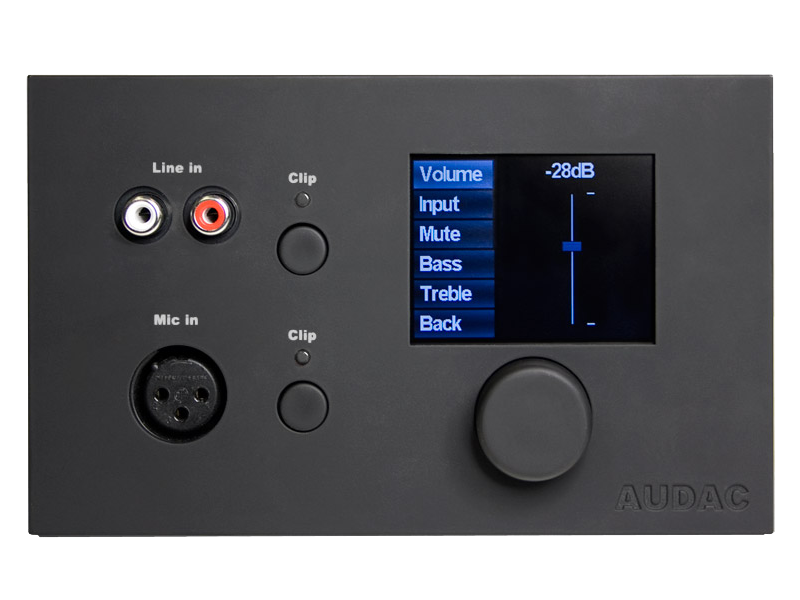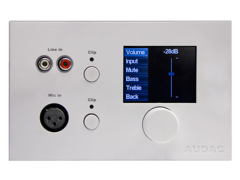 Digital All-In-One Wall Panel for R2. Audio source selection. Volume control. Line level input (RCA). Microphone level input (XLR). 15V Phantom power. 2.5” Graphical Display. Multi-Zone Control