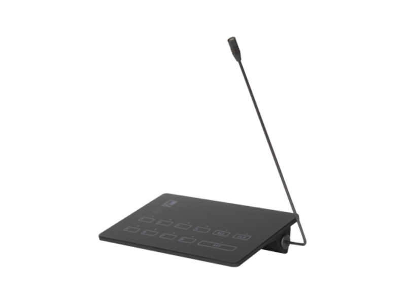 The construction is made of weighted ABS material and finished with an acrylic top panel. The buttons are integrated using the capacitive touch principle without any mechanically moving parts. Selection & status LED’s are integrated below the acrylic surface, giving an indication of the selected zones and databus status. Besides the zone selectors, quick operation is allowed through the Select & Clear all buttons, while the push-to-talk (PTT) button should be pressed during the announcement. An integrated chime tone is heard before any announcement.