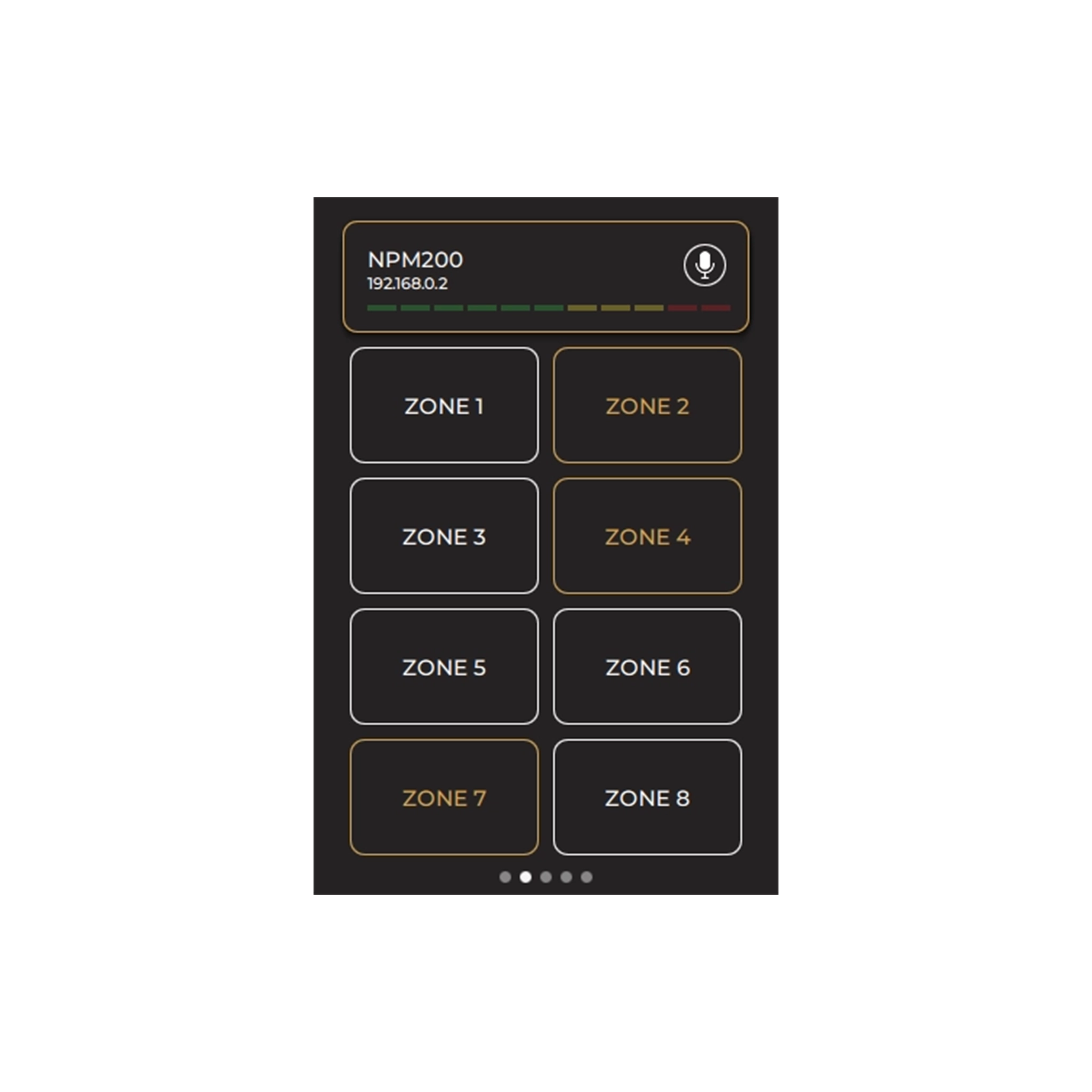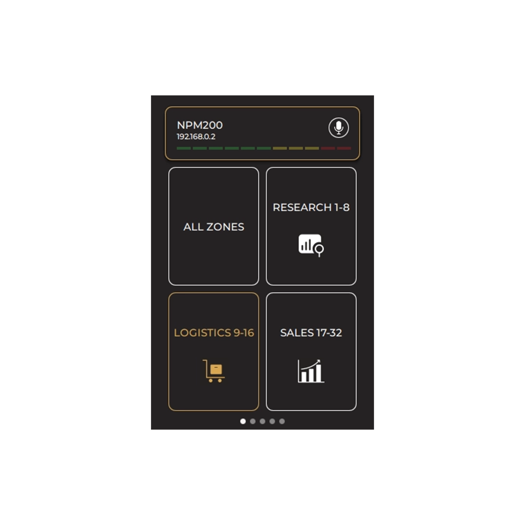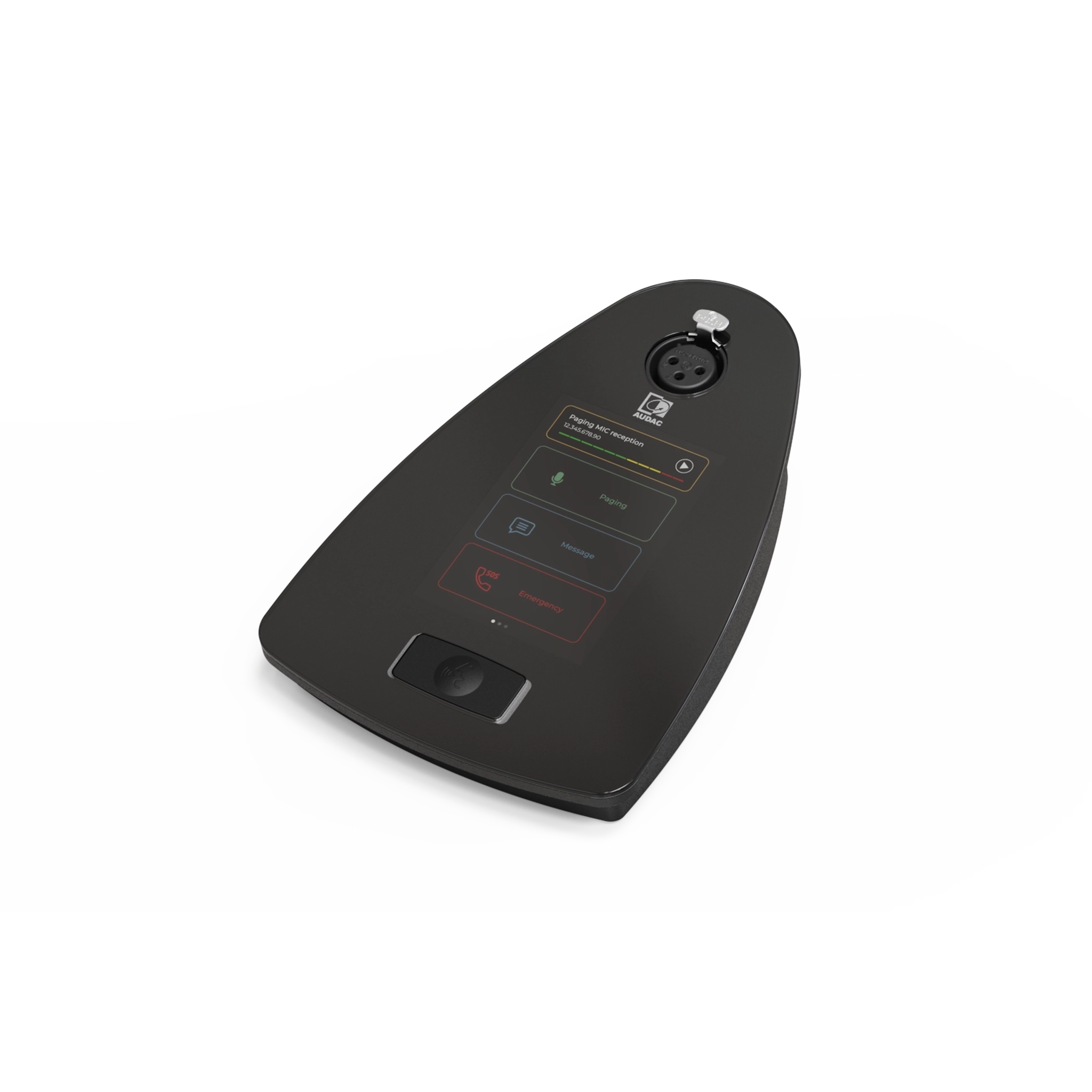 Touchscreen interface (3.5”) + RGB LED (PTT): VU, Clipping, Audio status (recording, playback, paging, …), Device status, Bus / priority status, Zones / functions overview