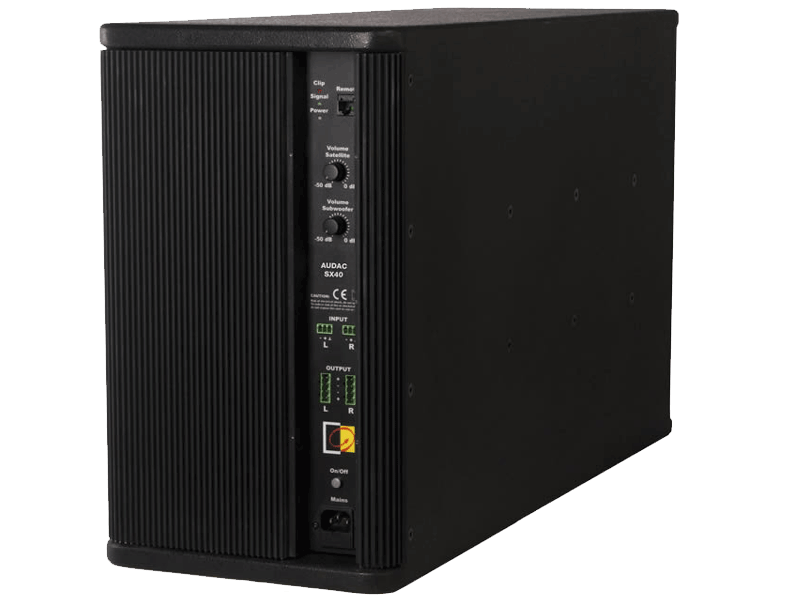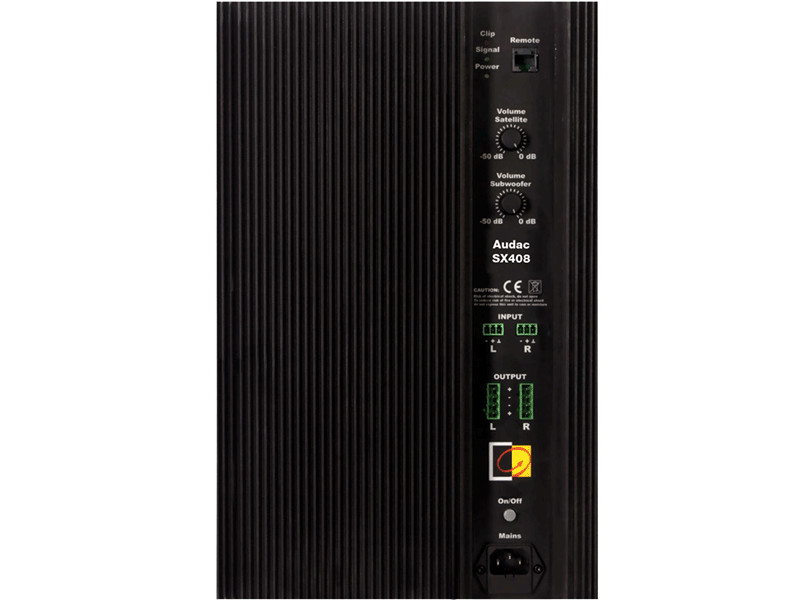 Besides the high efficiency of the class H amplifier, the SX408A also contains an automatic power on/off circuit to ensure the highest energy-efficiency. The volume of the Sub and satellite channels is individually controllable at the back of the subwoofer with two potentiometers, and the general volume can be controlled by an external volume control or wall panel, by connecting it to the built-in RJ45 connector.