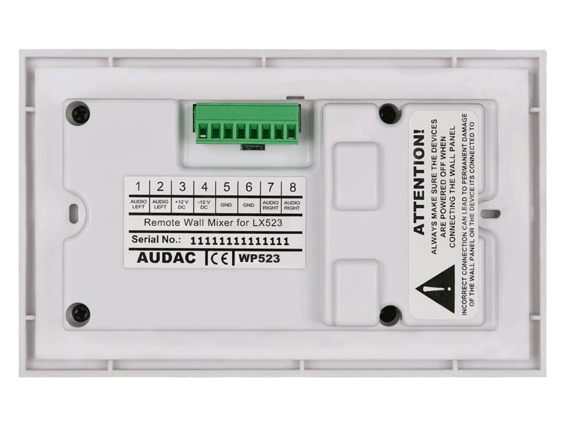 Remote Wall Mixer for Audac LX523. The WP523 is a Remote Wall Mixer which is meant to be used in combination with the LX523 Active Speaker system. It converts the signal coming from a stereo line-level audio source (such as CD-player, Tuner, MP3 player, … ) or balanced microphone to the level corresponding the differential signal input on the LX523 (RJ45).