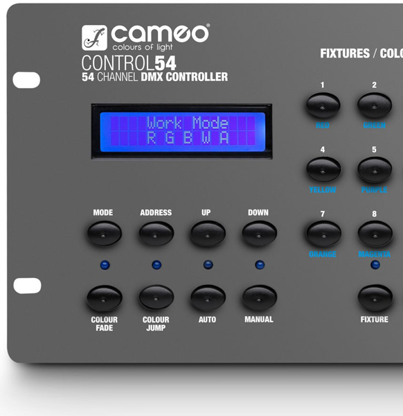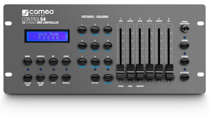 Control 54 is a compact DMX lighting desk that handles up to 9 fixtures or fixture groups. Providing easy and intuitive operation, the versatile console is an ideal choice for DJs, nightclubs, lounges and bars. It features 9 colour presets with quick-access buttons that double as fixture selectors and 6 faders to individually control Red, Green, Blue, White, Amber and UV intensity.