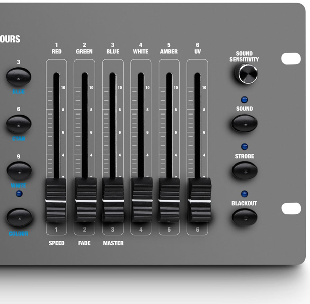 Multiple function buttons enable direct access to Sound Activation with adjustable microphone sensitivity, Strobe, Blackout, Colour Fade,