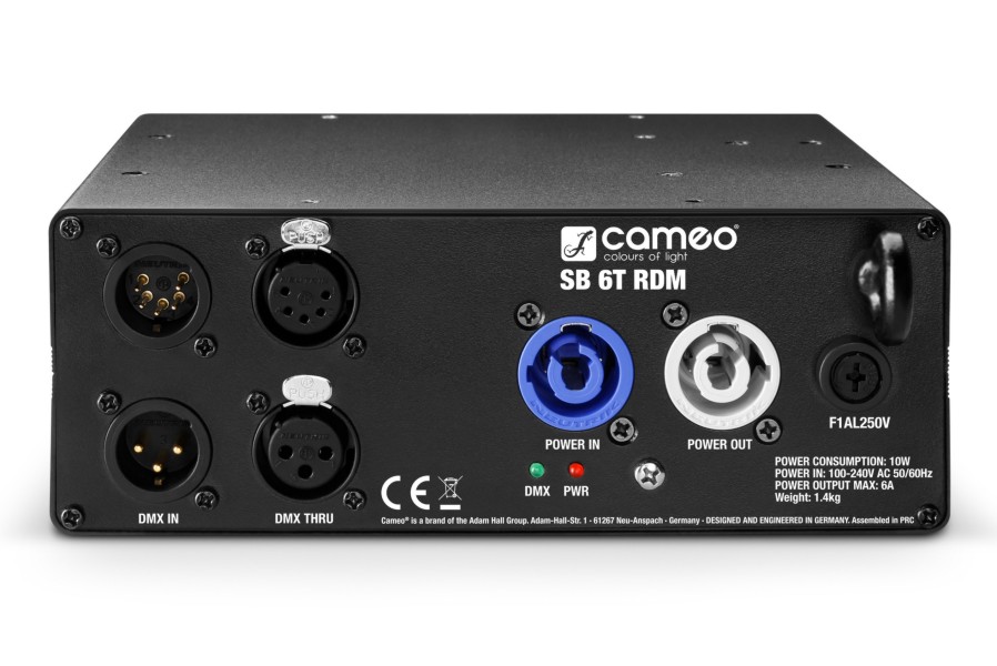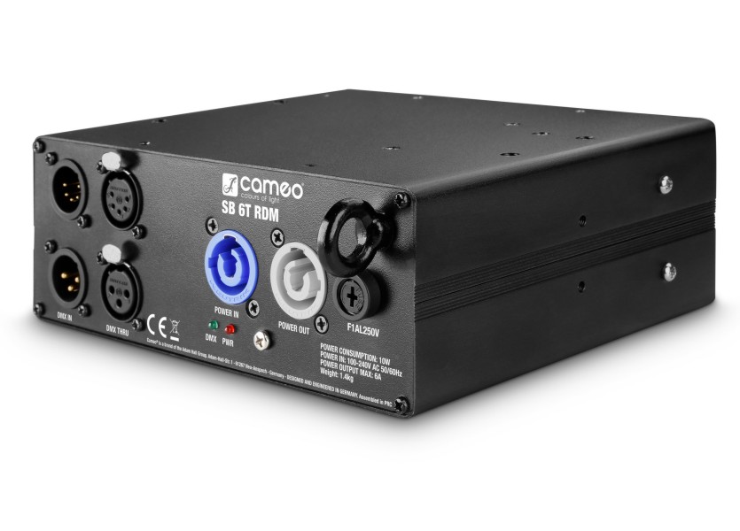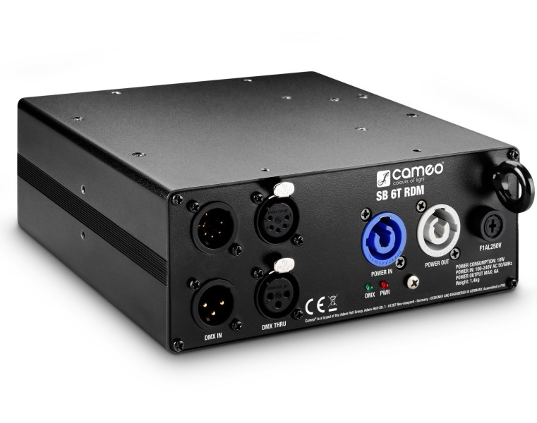 Designed for professional applications and supporting bi-directional communication, the Cameo SB 6T RDM is a 6-output DMX/RDM splitter with two inputs and two parallel thru outputs. It sends the incoming DMX/RDM signal to six separate output ports that are electronically and optically isolated. Each output channel has its own driver to boost the DMX/RDM signal to its original level. All inputs and outputs are fitted with both 3-pin and 5-pin Neutrik® connectors for maximum flexibility and reliability. Front and rear panel LEDs indicate the power and DMX status, and three M10 female threaded inserts facilitate truss mounting. The Cameo SB 6T RDM comes with a powerCON power cord.