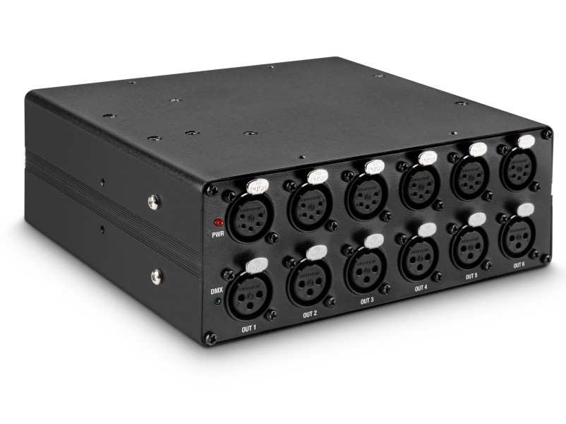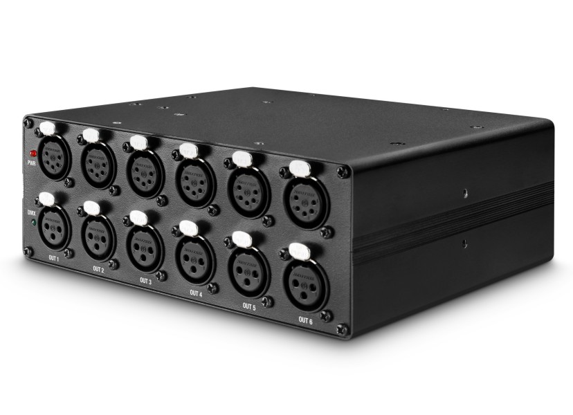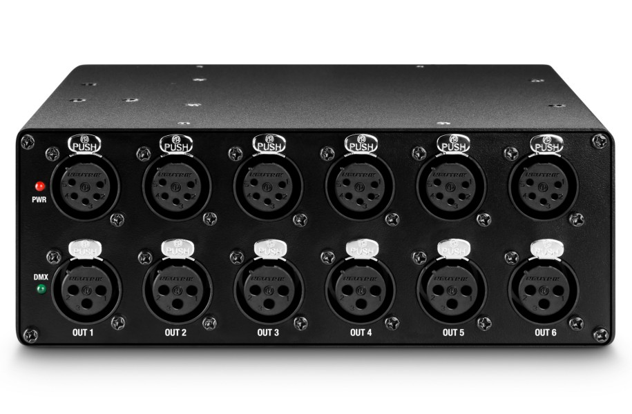 6-Output DMX/RDM Splitter/Booster with 3 and 5-Pin Connectors Professional 6-output DMX/RDM splitter/booster 6 optically and electronically isolated 3 and 5-pin XLR outputs Compact housing Original Neutrik® connectors for maximum reliability 3 x M10 threaded inserts for a variety of truss mounting options Power and DMX status indicators on front and rear panel Optional 2 U 19″ rackmount frames available for one or two SB 6T RDM