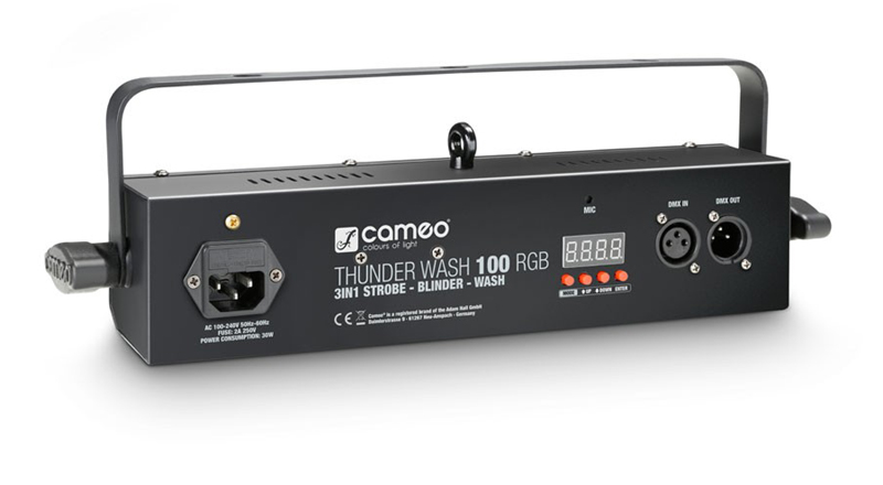 Thunder Wash 100 RGB comes with 3-pin XLR sockets for DMX input and output, 8 DMX modes with Dimmer, Flash frequency and duration as well as the ability to operate as a Master, Slave, or Standalone. An easy-to-read LED display with buttons for Mode, Enter, Up, and Down is used for manual operation, while the built-in microphone is used for Sound control.