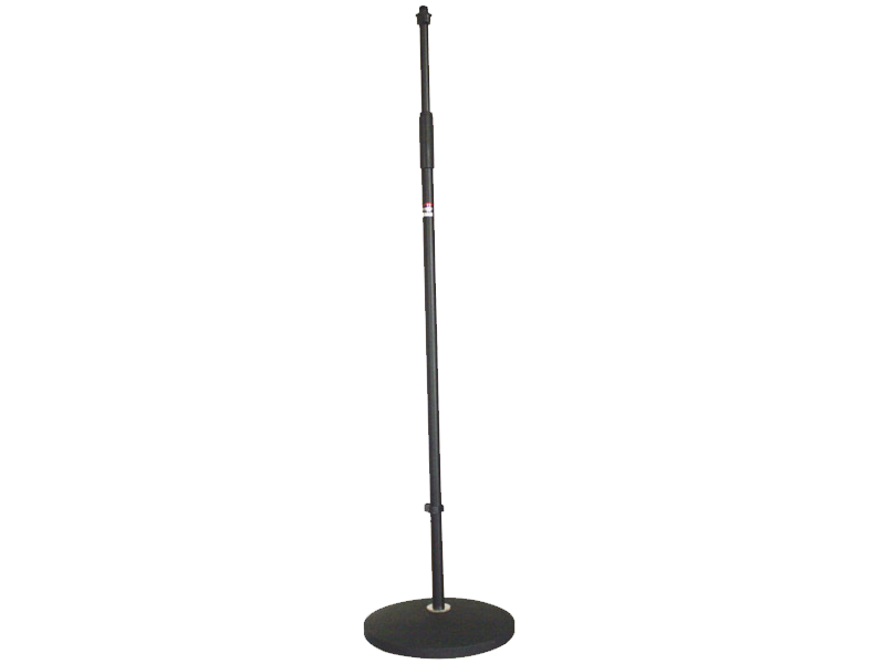 Straight microphone stand. Heavy cast-iron round base with anti-vibration rubber insert for noise filtration, plastic clutch-style height-adjustable system.