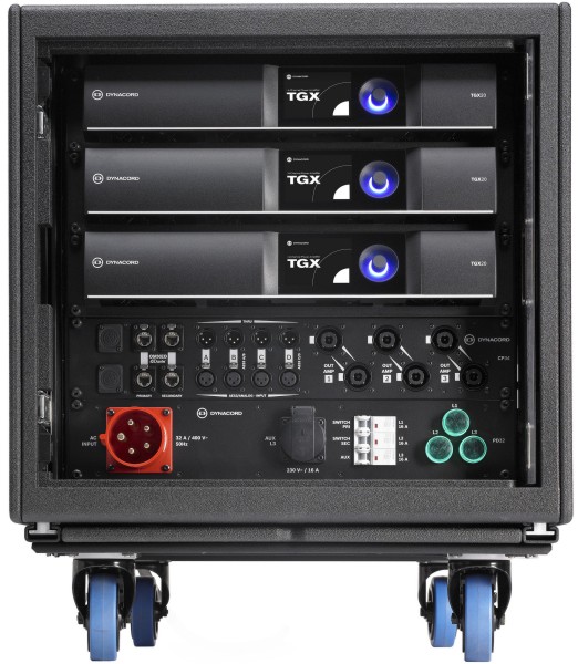 Dynacord TGX System Rack – Preconfigured System Rack for TGX Series Amplifiers Preconfigured System rack including three TGX20 DSP amplifiers, power distribution, input and output interfaces and network redundancy Power distribution mountable either on front or rear Integrated rack sliding doors Stackable on a single dolly
