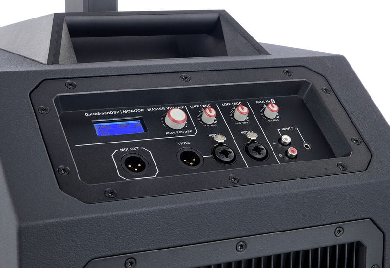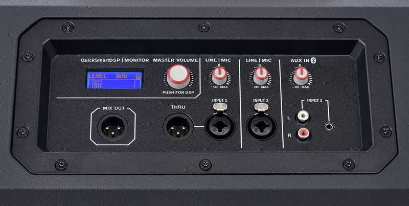 The processing engine allows for easy setup via four presets (Music, Live, Speech, and Club), three-band EQ, five user-programmable presets (Store and Recall settings), output delay, phantom power (+15V), visual monitoring of limiter status, input level control and meters, and master volume control to ensure optimal gain structure.