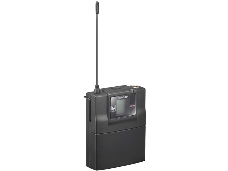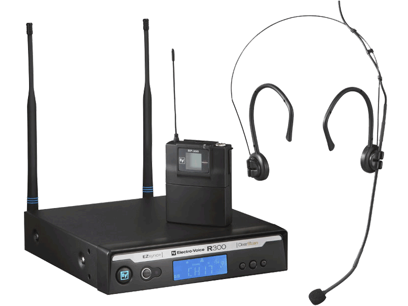 Head Worn System – HM3 Omni-Directional Microphone. The R300-E system includes the metal BP-300 bodypack transmitter, which uses two AA batteries. The HM3 microphone is comfortable for extensive daily use, including long presentations. Using a headwork microphone helps to control audio feedback and provides consistent audio while the speaker moves naturally around the stage.