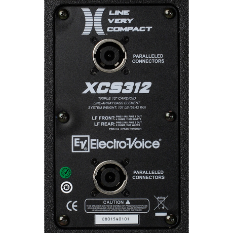 Cardioid Subwoofer Cabinet, 3 x 12″ DVX3120, integrated rigging & groundstacking. The Electro-Voice® XCS312 is designed for high-level, low-frequency extension to 40 Hz in a cardioid configuration. It uses three DVX3120 forced-air-cooled, 12-inch transducers capable of long, linear excursion and high power handling in a two-channel configuration.