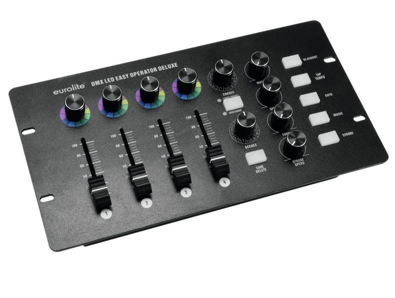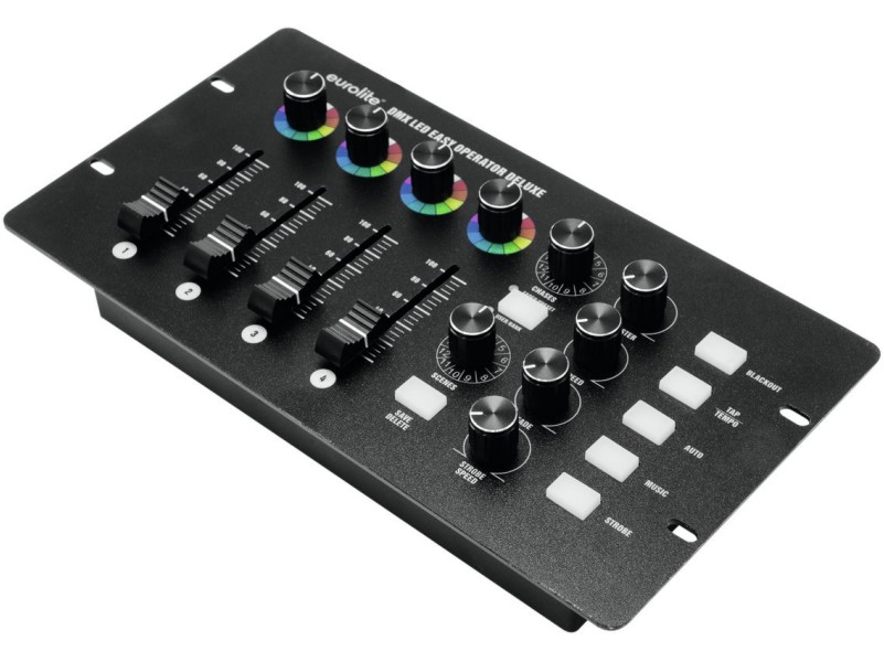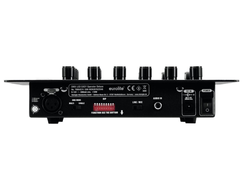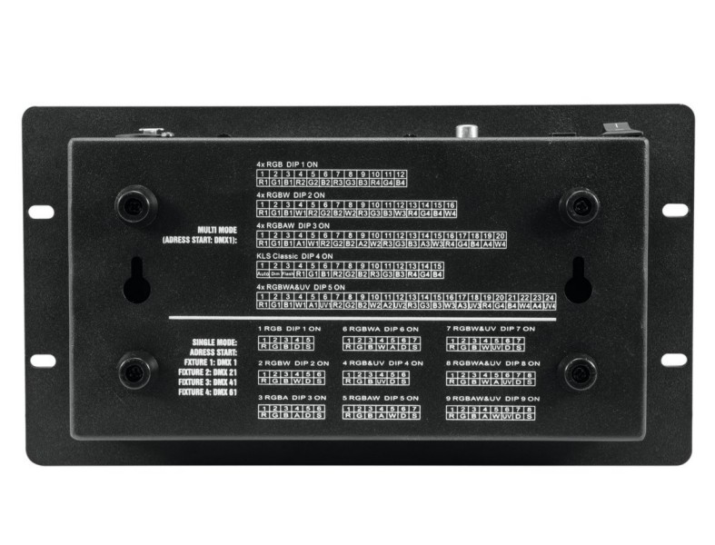 Controller for 4 colored LED spotlights or one KLS set with 4 segments DMX controller for standard LED spotlights Easy operation 4 LED spotlights or 1 KLS set with 4 fixtures can be controlled DMX channels for red, green, blue, amber, white, UV, strobe and master 9 different modes for the DMX channel sequence selectable 12 integrated preset programs and 12 user-definable programs (each with up to 12 scenes) Auto mode or sound control 4 color controls with 12 colors each 4 brightness controls Controls for overall brightness, running speed, fade and strobe speed Function buttons for Blackout, TAP/Tempo, Auto, Music and Strobe Compact desktop console Control: Sound to light via Microphone; Sound to light via RCA (f) mounting version; DMX Housing design: Desktop console
