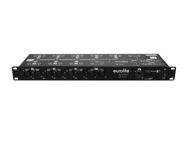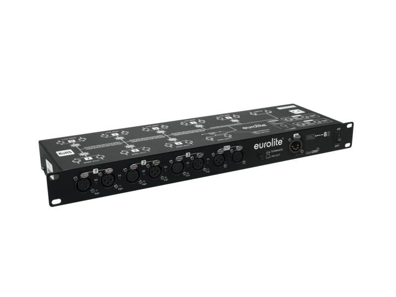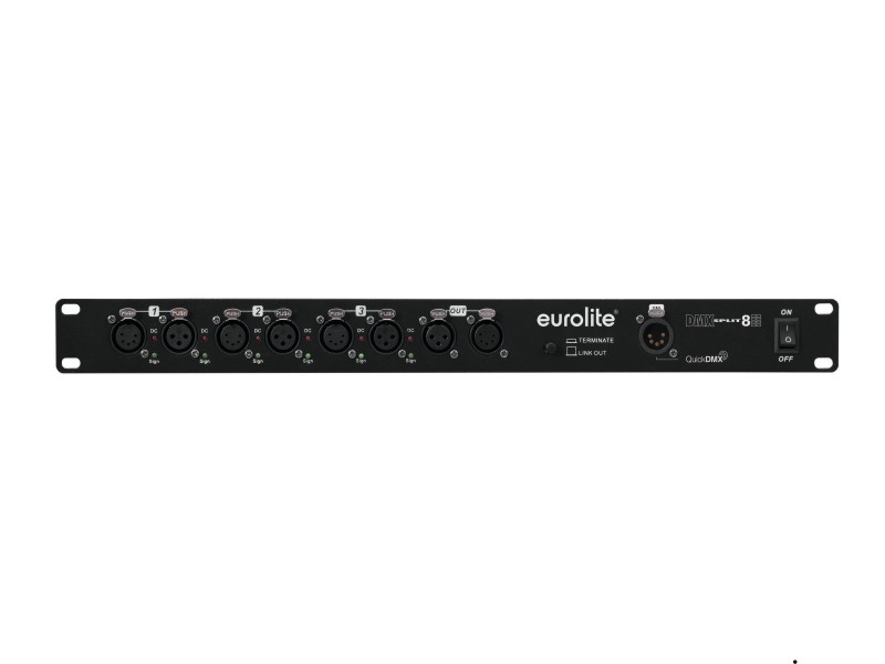 Splitter with 8 galvanized isolated outputs, 3/5-pin & QuickDMX XLR sockets DMX splitter for splitting one DMX input signal to 8 DMX outputs Connections: 1 x DMX input, 1 x DMX feed-through output, 8 x DMX output Additional QuickDMX input for wireless reception of DMX signals Input and outputs XLR 3-pin and 5-pin each Input and outputs galvanically isolated Each DMX output with independent driver and status indicators Input and outputs with a set of respective power supply and internal fuse Switchable termination resistor Rack mounting Control: QuickDMX via 5-pin XLR (M) mounting version (optional)