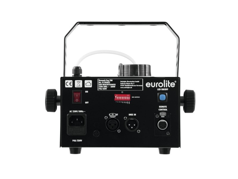 Compact DMX fog machine with 700 W power Compact fog machine with high output volume: 230 m³/min. Ideal for accentuating light and laser beams Concentrated and steady fog output Control via integrated DMX interface Manual activation via supplied cable remote control Temperature control via thermo switch Fan grille with blue LED illumination, switchable Operates on standard waterbased fluid Removable tank with level indication Metal housing with movable mounting bracket and safety eyelet Output distance: cca. 2.5 m Control: Wired remote control; DMX