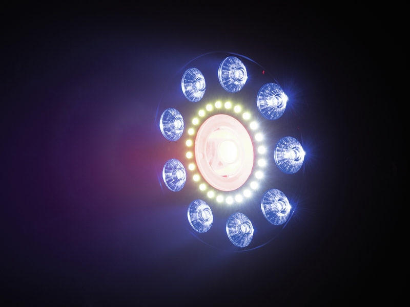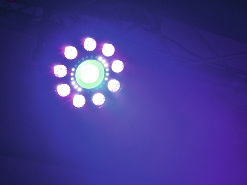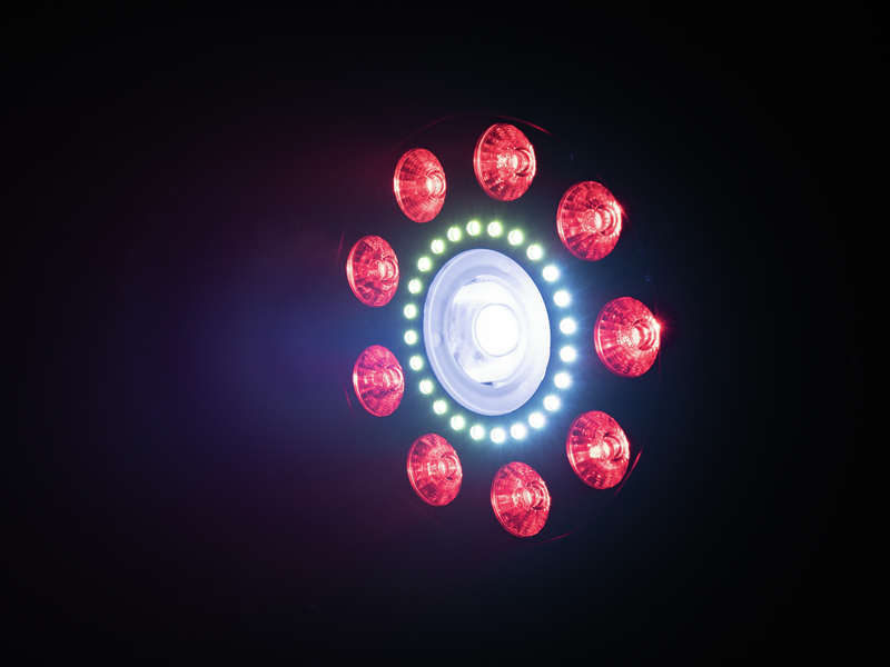 Equipped with 9 x 10 W HCL LED in RGBAW+UV in the outer ring, 1 x 15 W COB in RGBW in the middle as well as a ring with 24 SMD LEDs in white