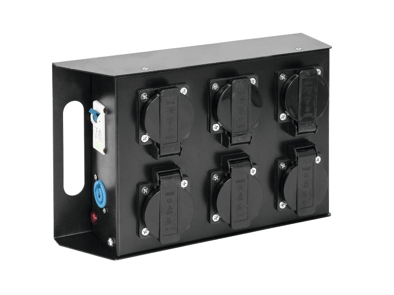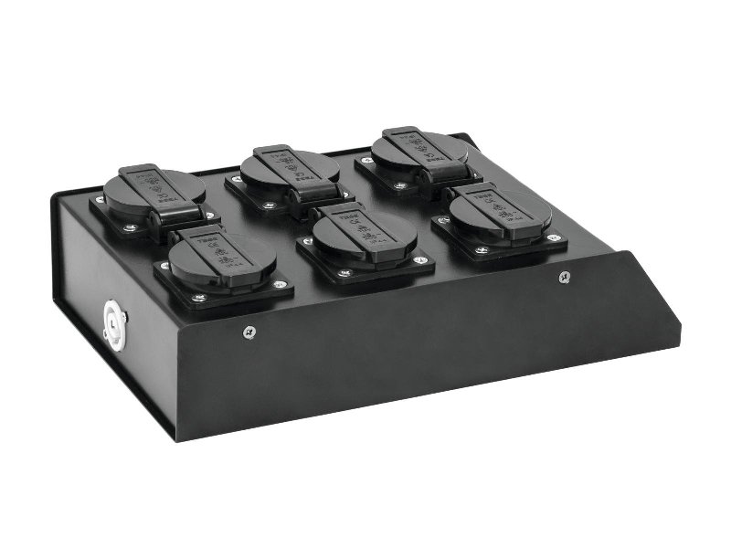 Heavy-duty power distributor with P-Con input and output 1 x P-Con input, 1 x P-Con bypass 6 flap safety plugs Designed for flexible use on stage Robust steel housing Protection fuse: LS C16 A/230 V