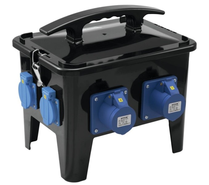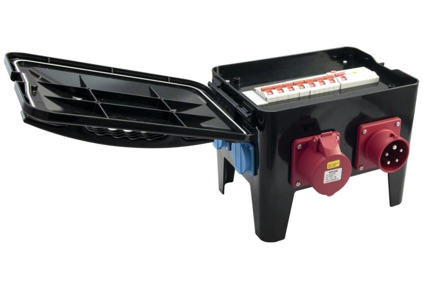 Power distributor with RCD 16 A Portable, compact socket distributor for outdoor use Splash-proof (protection rated IP44) Solid black plastic box with handle 1 x CEE plug 400 V/16 A, 5-pin 1 x CEE socket bypass 400 V/16 A, 5-pin 2 x CEE socket 230 V/16 A, 3-pin 4 x Safety socket 230 V/16 A RCDs and MCBs are safely protected behind a hinged lid Protection fuse: 1 x RCD 40 A, 4-pin, 30 mA and 6 x MCB C16 A/230 V