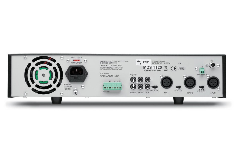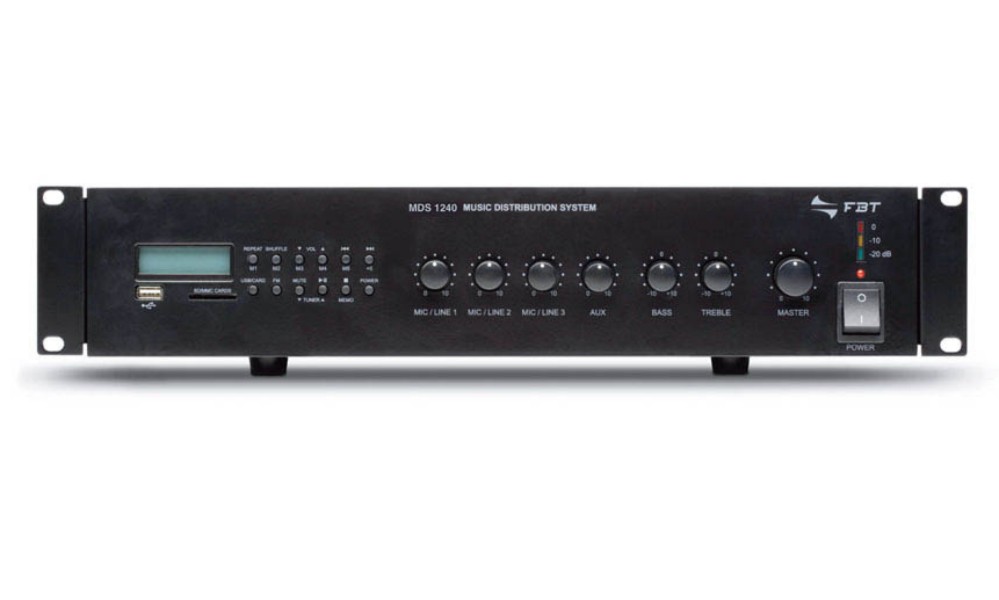 FBT MDS1240 – Integrated amp – 240W – MP3 player via USB/SD /MMC card – digital tuner – 230V/115V Power: 240W Outputs: 100-70-25V Corrections: 100 Hz, 10 kHz Inputs: 3xXLR mic, RCA Mic 1 with priority Line output Dimensions: 430 x 88 x 270 mm Weight: 10.5 kg