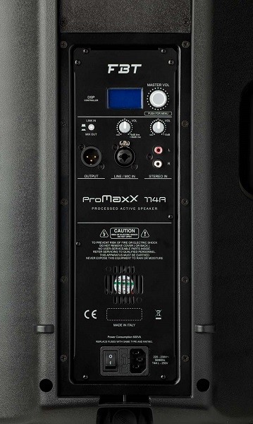 FBT PROMAXX 114A – PROCESSED ACTIVE SPEAKER 700W RMS + 200W RMS 135,5 dB SPL 2-way, bi-amplified, bass reflex design cabinet Biamped: 700W RMS LF, 200W RMS HF, power amplifiers in Class D for LF and in Class H/AB for HF with switch mode power supplies Digital signal processor with graphic display Control Panel features balanced XLR/Jack input, XLR LINK OUT, 2 x Volume, RCA Stereo input, DSP display with rotative encoder and push 2 x M10 suspension points, 35 mm (1,3/8″) top-hat speaker stand socket, wall bracket mount flange plate 90°H x 60°V constant directivity horn Front of House or Stage Floor Monitor: with 12°, 40° and 55° monitoring angles