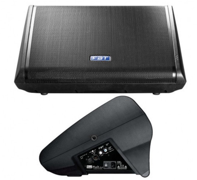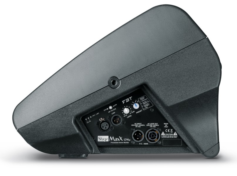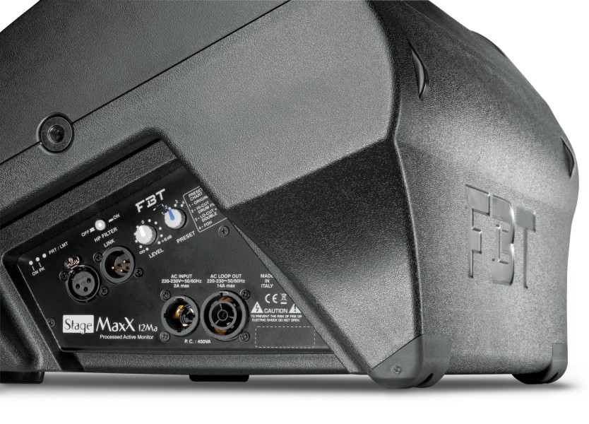 FBT STAGEMAXX 12MA – PROCESSED ACTIVE REINFORCEMENT MONITOR 400W + 100W RMS – 130 dB SPL 2-way, bi-amplified, bass reflex design cabinet Coaxial custom FBT 12″ B&C speakers with 64 mm (2.5″) voice coil B&C 25 mm (1″) exit throat compression driver and 44 mm (1.7″) voice coil Bi-amp: high dynamic Class D amplifiers 400W+100W RMS to provide a pleasant sound even at loud volume High efficiency switch mode power supply Digital Signal Processor with 4 factory equalization presets