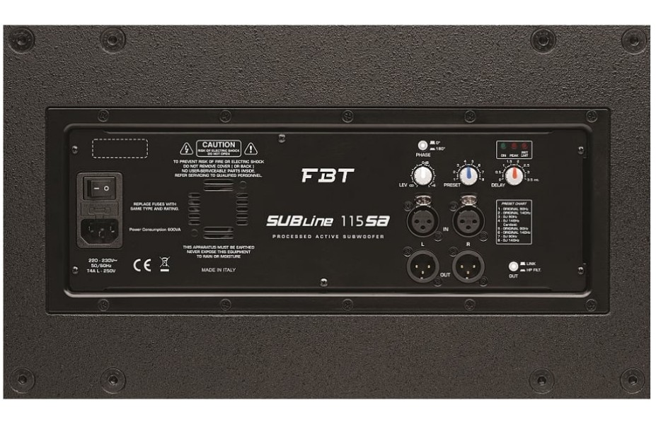 FBT SUBLINE 115SA – PROCESSED ACTIVE SUBWOOFER 1200W RMS – 132/135 dB SPL Bass-reflex design with high SPL and punch 380 mm (15″) high excursion magnet woofer with 75 mm (3″) voice coil Frequency response from 40Hz to 140Hz New amplifier engineered and manufactured by FBT, 700W RMS LF in Class D Digital Signal processor with 8 presets, 2 equalization with 2 LPF Crossover settings, cardioid configuration
