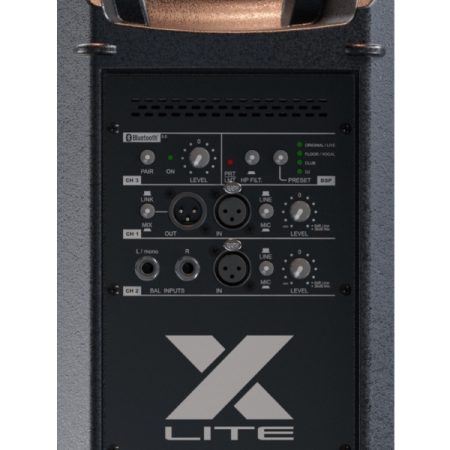 The control panel features a three-channel mixer with two micro-line inputs, a stereo input and a dedicated channel for bluetooth 5.0; two xlr inputs, stereo input, xlr output with ch1 or mix link selector, hp filter, two mic-line selectors, dsp preset selector, bluetooth 5.0 with pairing led. 4 x M10 rigging points built-in into the cabinet along with the optional mounting brackets allow the FBT X-LITE 112A speaker to be surface mounted on walls or ceilings.