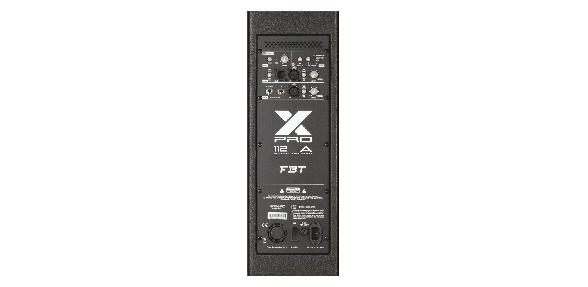 FBT X-PRO 112A – PROCESSED ACTIVE SPEAKER 2-way bi-amplified bass reflex FBT Custom 320 mm (12″) LF woofer with 50 mm (2″) voice coil FBT 25 mm (1″) throat /35 mm (1.4″) voice coil HF compression driver 50 Hz to 20 kHz Frequency Response 80° H x 50° V constant directivity rotatable horn 35° or 45° monitor taper