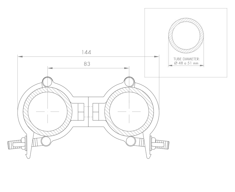 Light-weight aluminium double swivel clamp coupler (Swivelling 360º). Designed to be used on trusses / tubes with an external diameter from 48 mm to 51 mm.