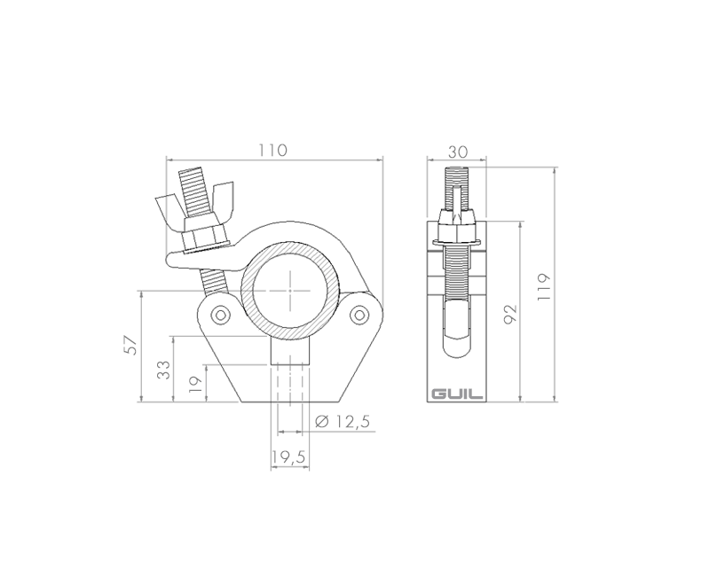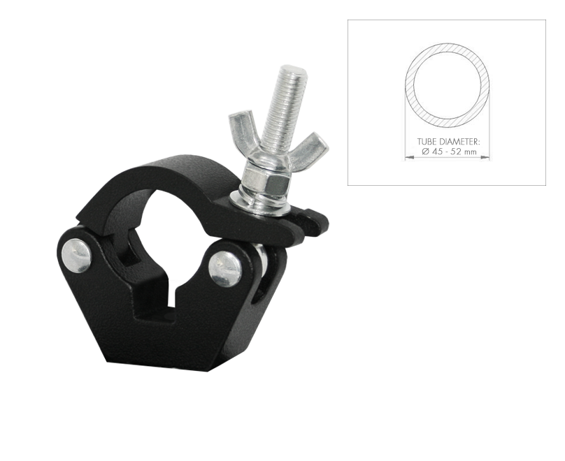 Aluminium half coupler for heavy loads (500 kg). Designed to be used on trusses / tubes with an external diameter of 45 mm to 52 mm. Double blocking system with nut and wing nut which makes it the right coupler to the most demanding set-ups like in events, theatres, live shows, etc. where the most stringent safety requirements must be met.