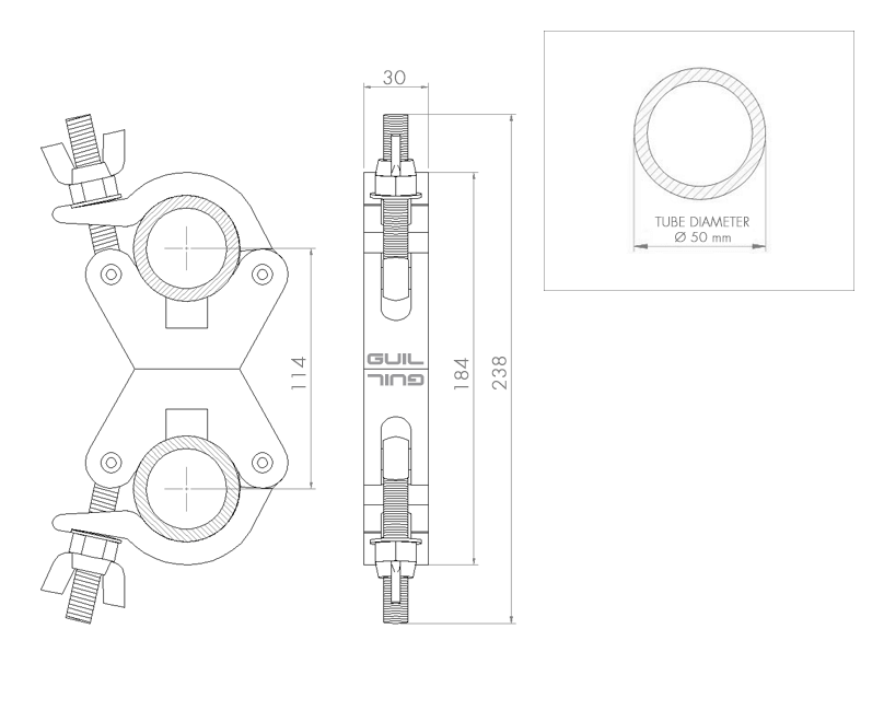 Its versatility provides a secure attachment of two tubes in different positions: adjacent, perpendicular, parallel tubes etc. This coupler is similar to the ABZ-05 but thinner (30 mm), which makes it more appropriate for installations where a high load capacity is required but the space on the tube where the coupler is to be fitted is limited.