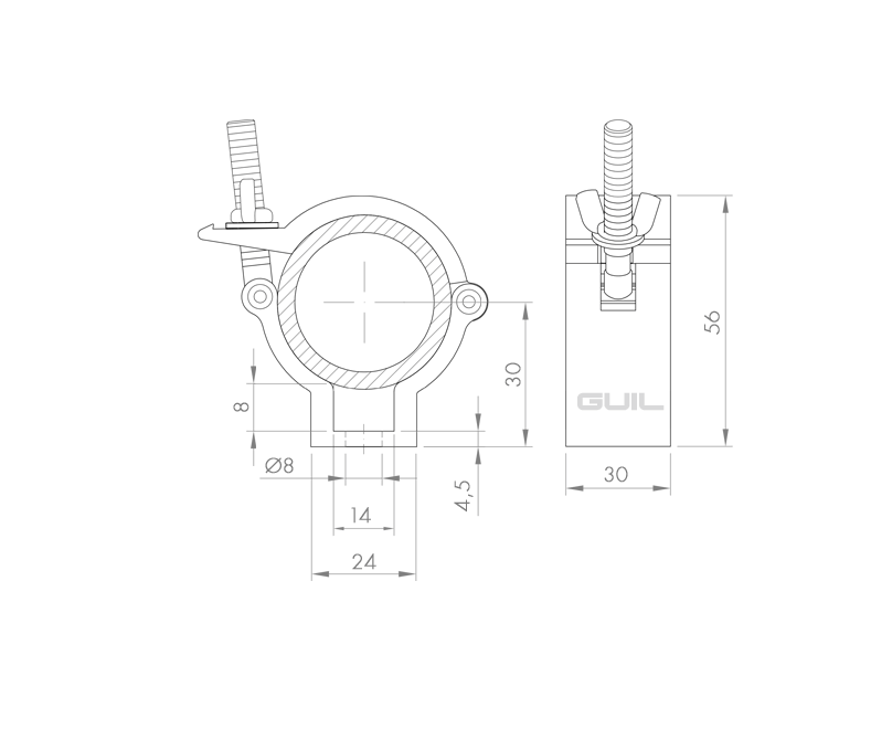 Light-weight aluminium clamp coupler with wing nut and bolt, for light loads and thin tubes / trusses.