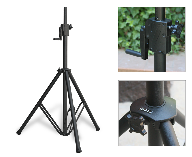 Telescopic wind-up stand for speakers is raised using gear-teeth mechanism with automatic breaking (Lifting is very easy, with no effort at all). It is made in aluminium and finished with black, anti-scratch paint for maximum durability and sturdiness.