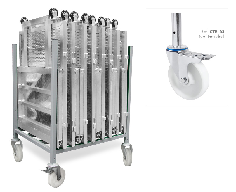 For easier handling and manoeuvrability, this useful container can be converted into a trolley just by adding our set of four wheels ref. CTR-03 (not included). This set consists of four Ø 200 mm swivel wheels with brakes, fitted with Ø 35 mm solid spigots to guarantee a secure connection to the container. Container height with the set of wheels is of: 151 cm.