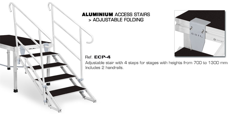 ECP-4 Adjustable Stair in reinforced aluminium with 4 steps for stages of 70 to 130 cm high. Two handrails & connectors included