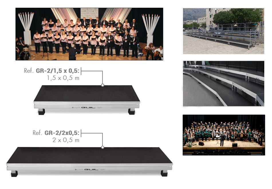 GR-2 choral risers offer the best solution for any lightweight function, either for permanent indoor installations or temporary outdoor events. Thanks to their versatility the GR-2 modules allow you to make risers of as many levels as needed. Contact our sales team for us to design the choral riser that best suits your needs.