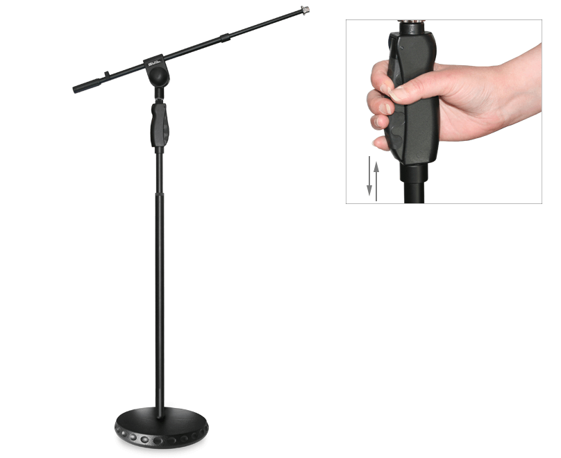 Heavy-duty microphone stand with telescopic arm and round base. One-handed height adjustment.