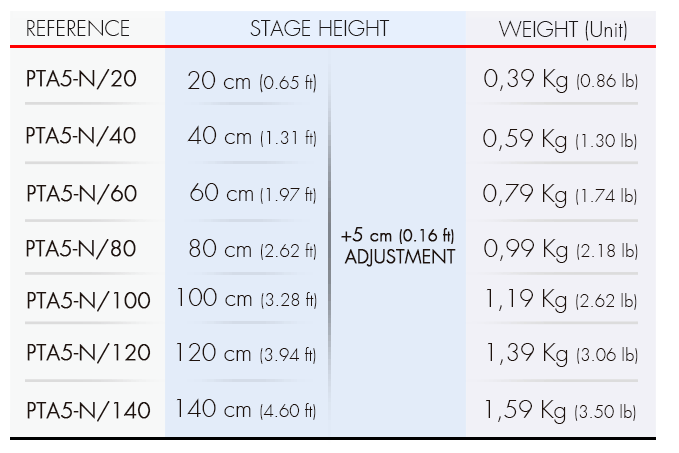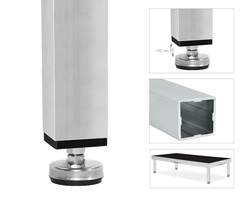 Fixed height leg with square profile of 50 x 50 mm manufactured with extruded aluminium. This removable leg is provided with a stainless steel threaded bolt that has a non-skid rubber foot pad (adjustable by 50 mm), ensuring a perfect fit to any surface.