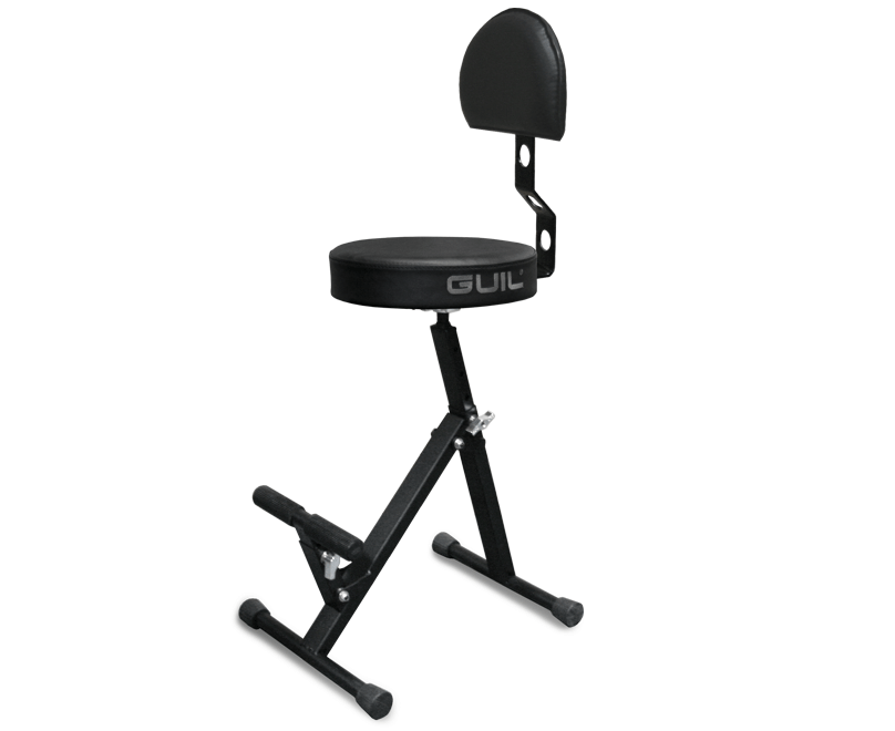 High stool for musicians with adjustable backrest, footrest and seat. It is fitted with a high-quality round seat, upholstered in synthetic leather, with extra thickness and firmness that provides superior comfort.