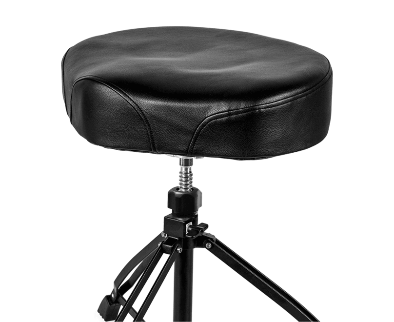 Professional drum stool fitted with a high quality ergonomically designed seat (motorbike style), upholstered in synthetic leather, with greater thickness and firmness for maximum comfort. It has a folding base with chrome plated finish