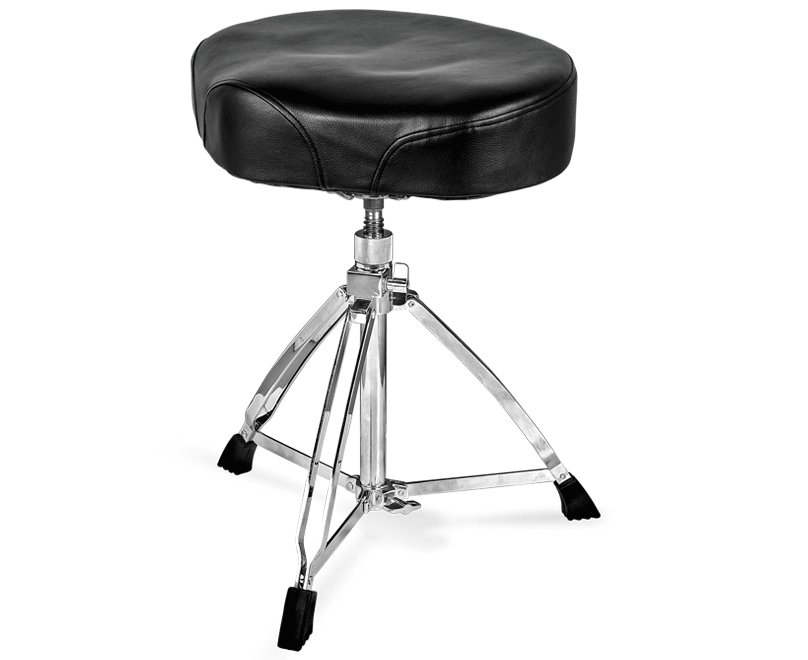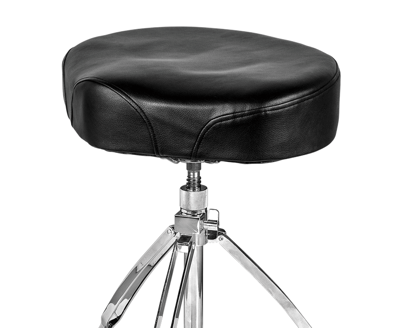 Professional drum stool fitted with a high quality ergonomically designed seat (motorbike style), upholstered in synthetic leather, with greater thickness and firmness for maximum comfort. It has a folding base with chrome plated finish