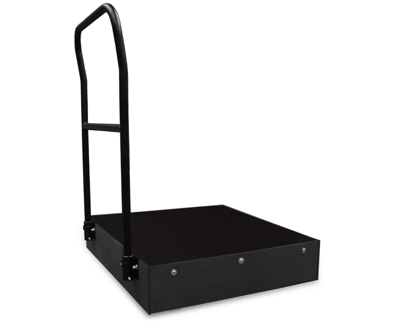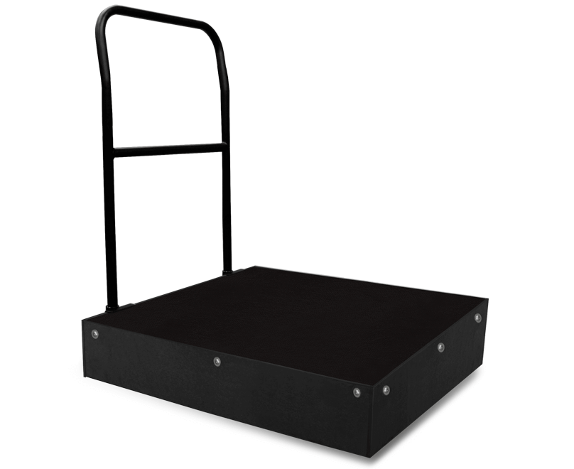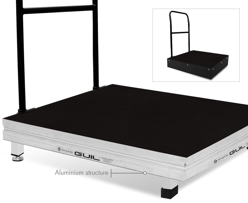 Weather resistant, 1 x 1 m Conductor’s podium, made with extruded aluminium and high quality, 100% Birch plywood panel (WBP). It is provided with a detachable rail made in aluminium and finished in black powder-coat paint and an elegant wooden skirting which covers the base of the podium.