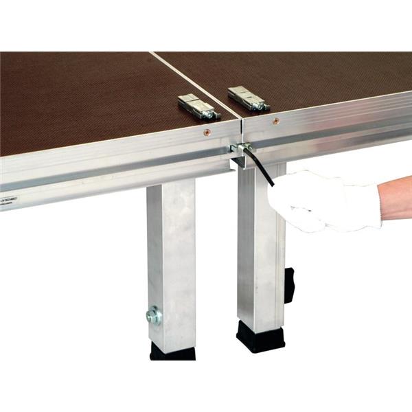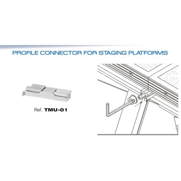 Quick joining system for platforms TM440, TM440XL, TM440XXL, TM440S and TM441 which connects the platforms by their profiles (rail). The TMU-01 connector, made with injection molded metal with a zinc plated finish, is designed to both join and level the platform. It is a useful component as it guarantees that the platforms are held seamlessly together and are perfectly levelled.