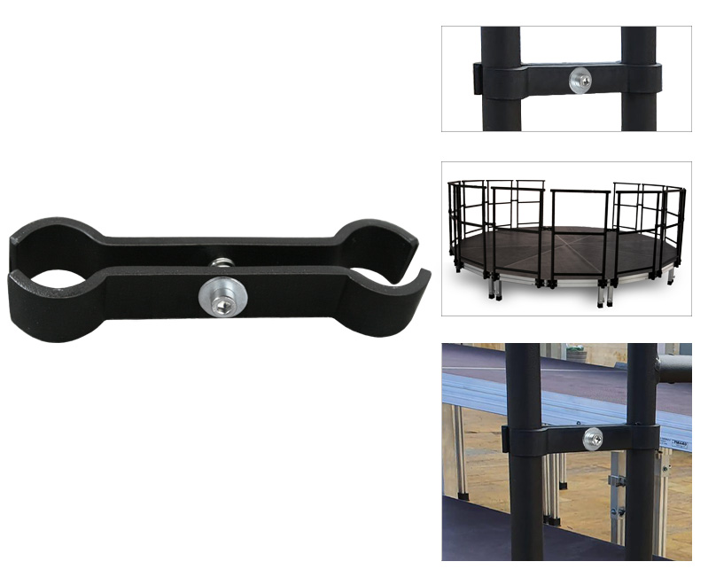 TMU-06 connector is made of two metallic clamps (Finished in a textured, black, anti-scratch paint.) which can be adjusted to attach safety rails placed at different angles (corners).